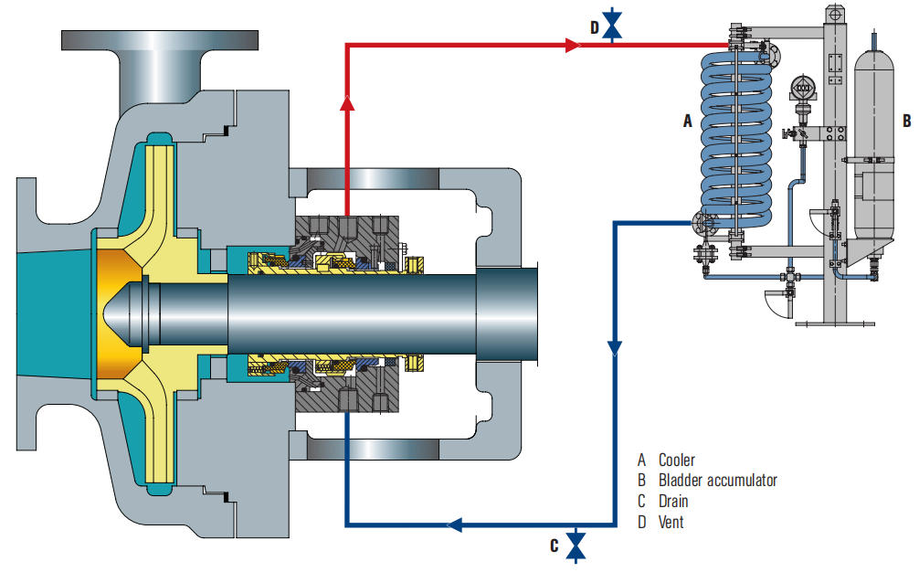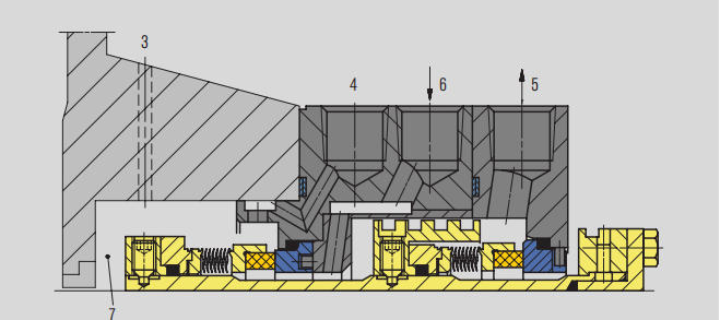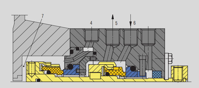 • Користи отвори за контрола на протокот за да го ограничи протокот на течноста за испирање до механичката заптивка.